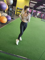 The halter design stabilizes your bust without digging into your neck, reducing irritation during long sessions. Thumb holes keep sleeves secure and double as lightweight hand warmers during outdoor warm-ups. The breathable knit prevents cling and keeps layers fresh even in heated studios, while the lightweight compression fabric enhances shape and recovery.